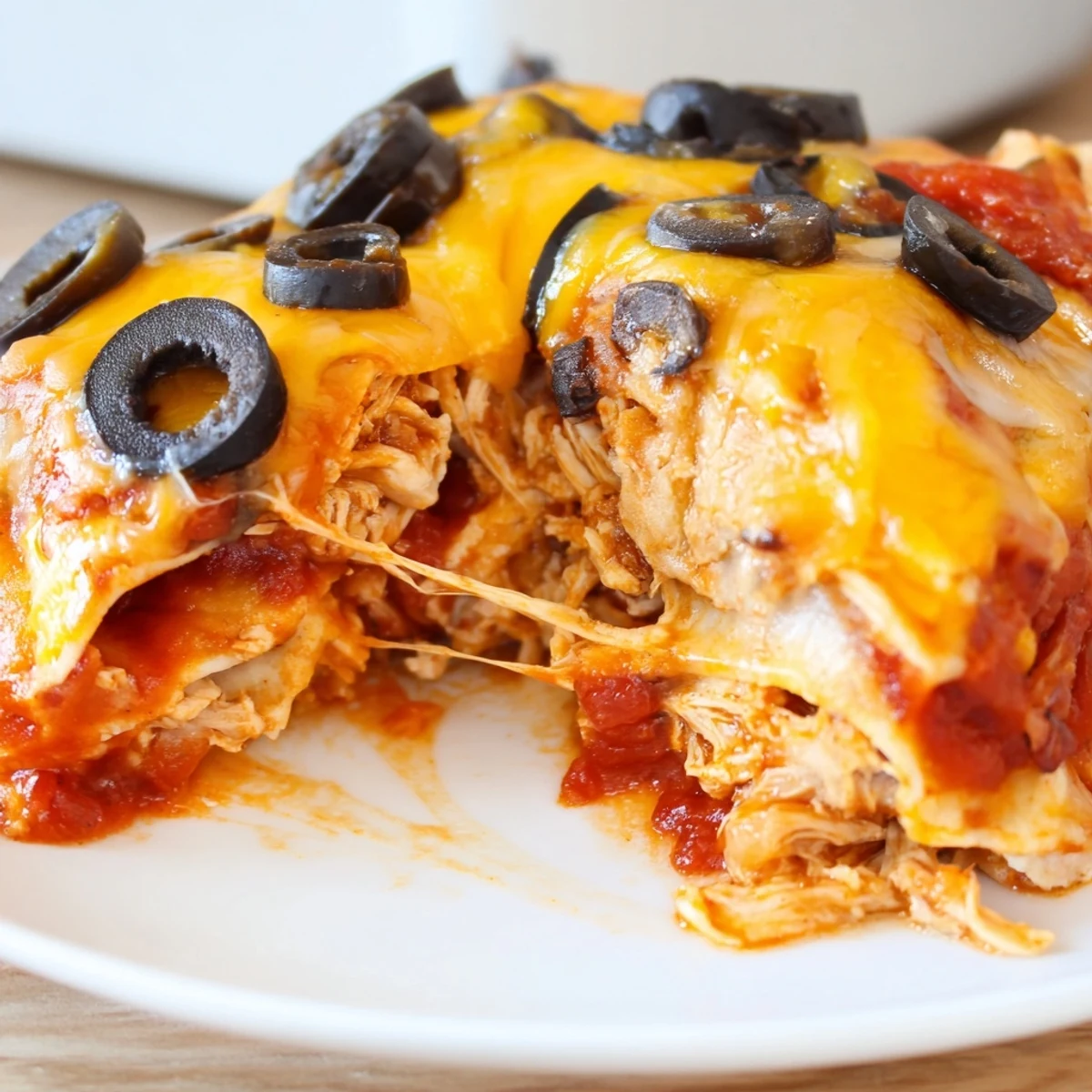 - Layer the final tortillas, pour the remaining 1/2 cup sauce over them, and top with the last of the cheese plus olives if you're using them
