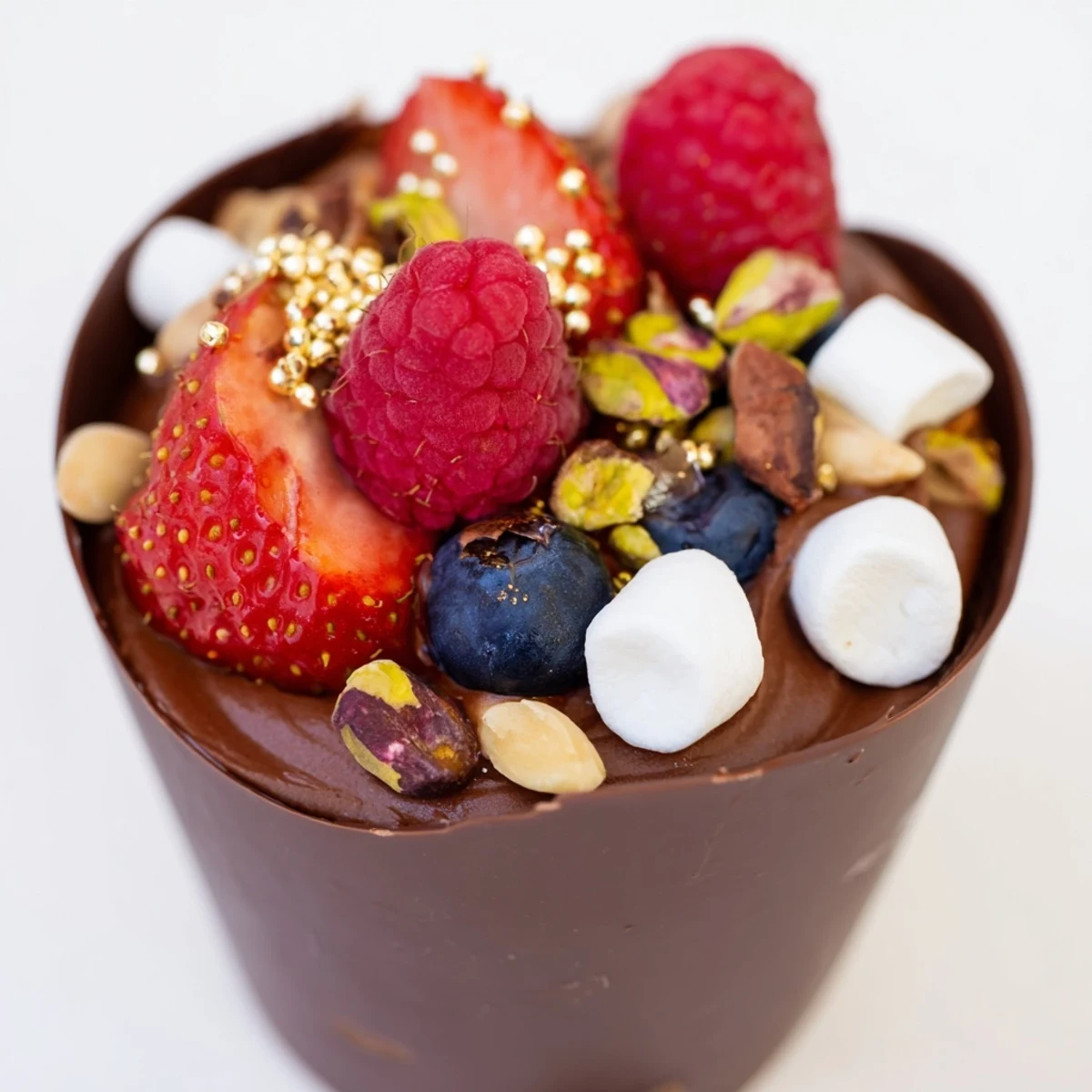 - Fill each chocolate cup about two thirds full with the mousse, then artfully arrange berries, nuts, marshmallows, and chocolate curls on top before chilling for at least 20 minutes to set.