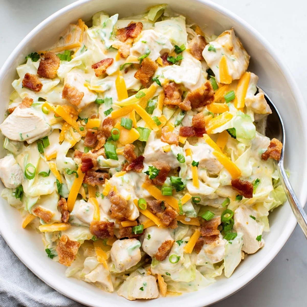 This satisfying bowl brings together crispy bacon, tender chicken pieces, and thinly sliced cabbage all coated in a velvety homemade ranch cream sauce. The dish comes together in one skillet, starting with crisping the bacon and browning the chicken, then sautéing the cabbage until tender-crisp before bringing everything together with the rich, tangy sauce.