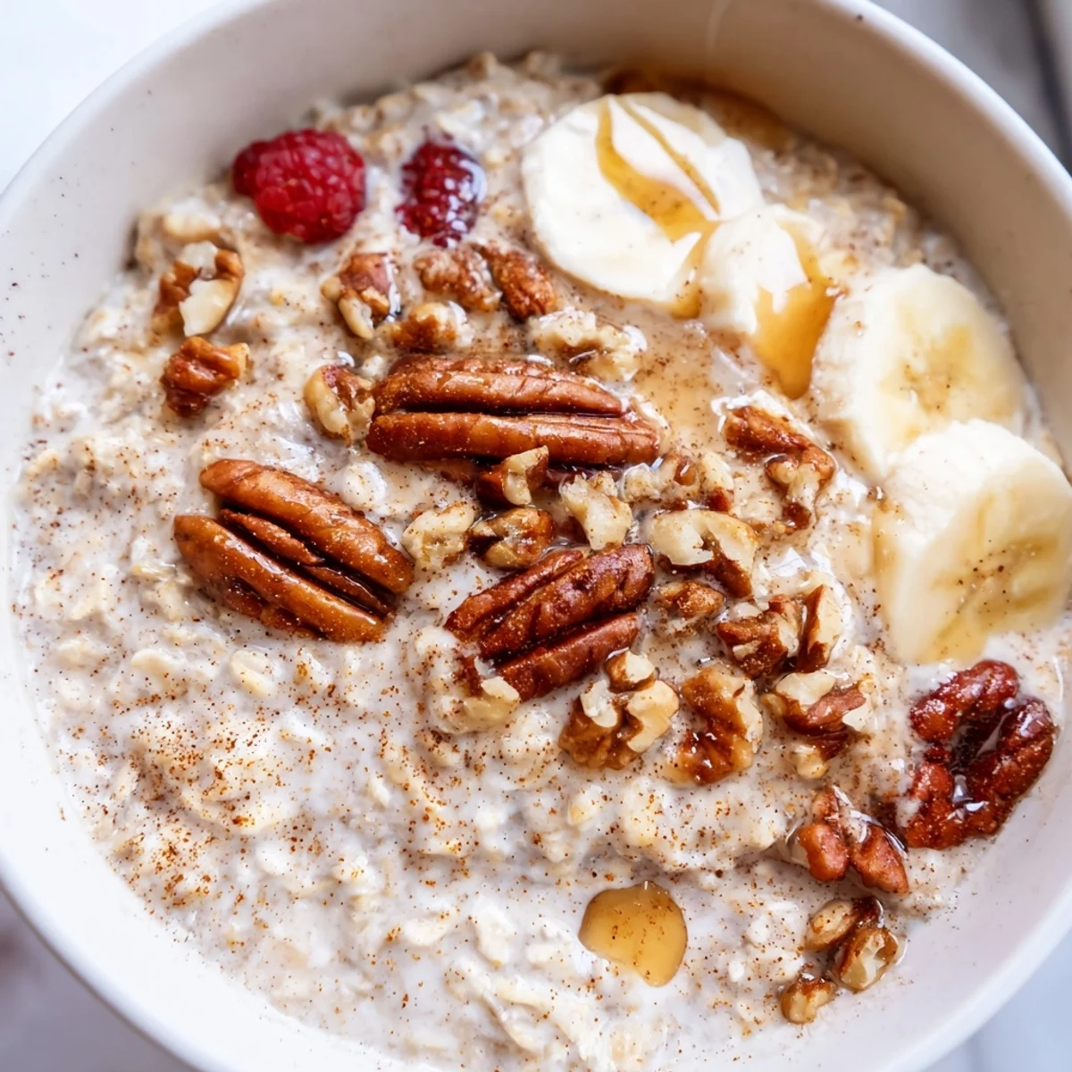 These overnight oats combine old-fashioned rolled oats with milk and Greek yogurt for a perfectly creamy texture. Pure maple syrup and ground cinnamon infuse warm sweetness throughout, while chopped pecans add satisfying crunch the next morning. Simply mix everything together before bed, refrigerate overnight, and top with pecans and extra maple syrup in the morning. The result is a wholesome, filling breakfast that's ready when you are.