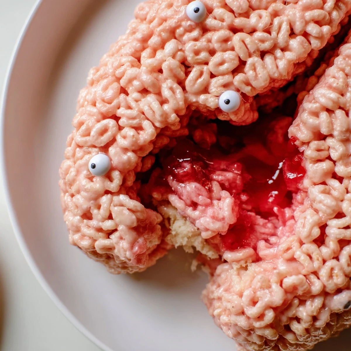 This spooky Halloween dessert transforms classic crispy rice treats into an eerie brain-shaped centerpiece. The sweet, crunchy cereal exterior gets a pinkish-red hue to mimic brain tissue, while a hidden cavity holds raspberry or strawberry jam that dramatically oozes out when sliced. Ready in just 40 minutes, this vegetarian dessert serves eight and offers the perfect balance of textures—crispy, chewy marshmallow coating giving way to smooth, tart berry filling. Ideal for Halloween parties, haunted house gatherings, or any event calling for delightfully gruesome sweets that taste as good as they look.
